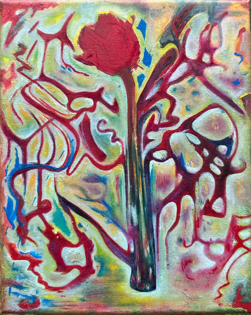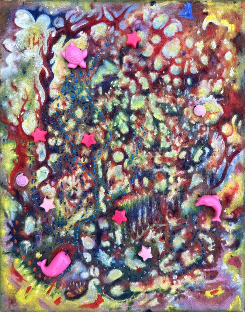 Acrylic, oil, embroidery thread, and craft beads on canvas