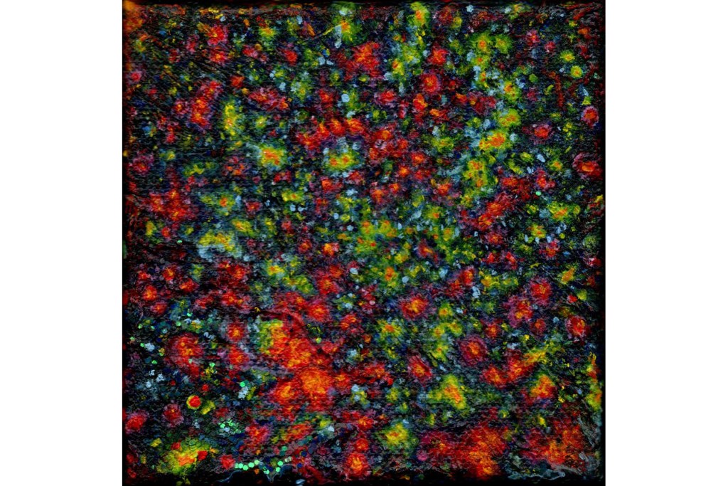 Acrylic, oil, and glitter on canvas